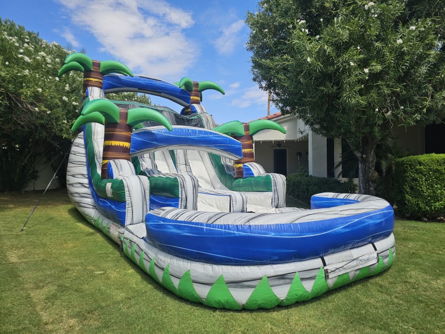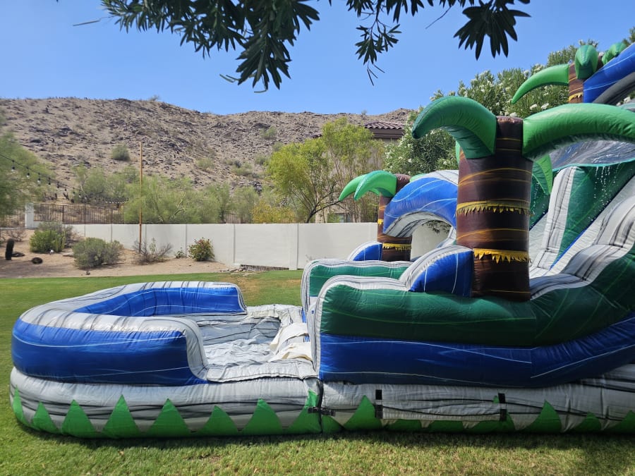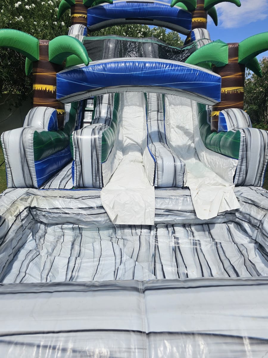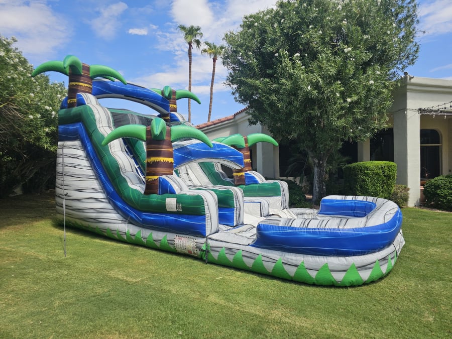 If you can't go to the beach... bring the beach home! Cool off with this beautiful tropical water slide in the comfort of your home. With vibrant shades or gray, green, and blue... a large pool and double lane slide you won't even need to spend gas to relax and have fun.
