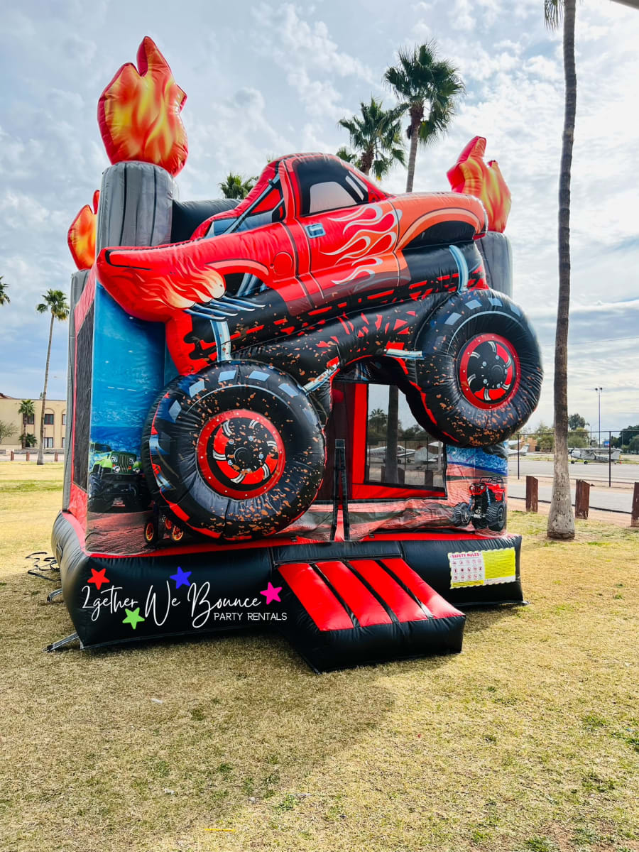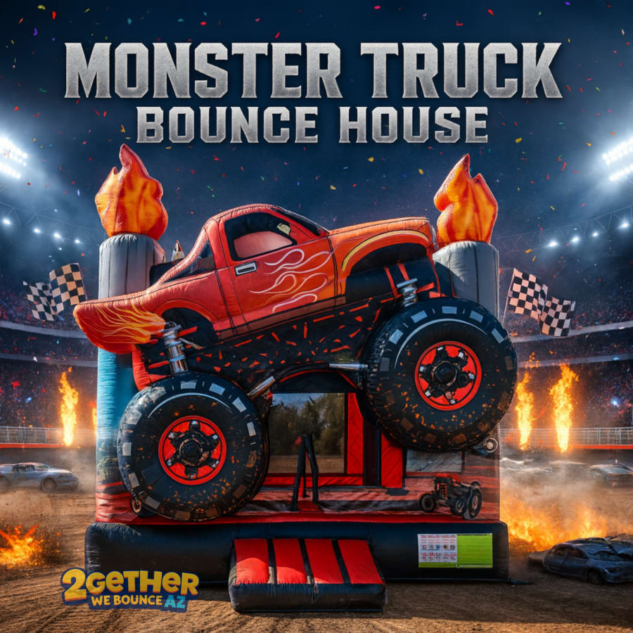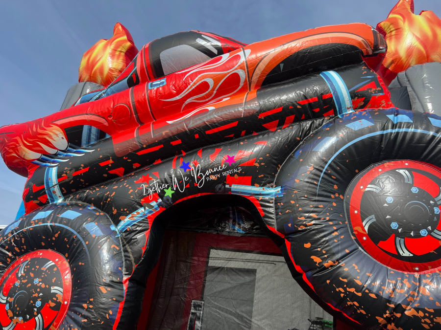 BOOM! VROOM! BOUNCE! Our Monster Truck Bounce House brings all the energy of a real arena showdown right to your backyard or event! With its towering flame decals, oversized wheels, and detailed truck body perched on top, this inflatable is a must-have for monster truck fans of all ages.