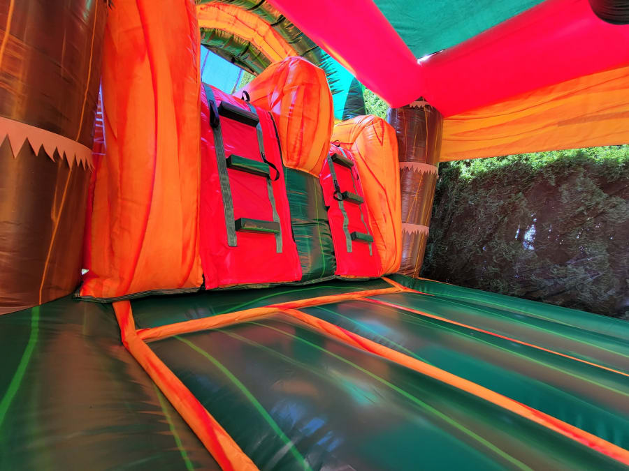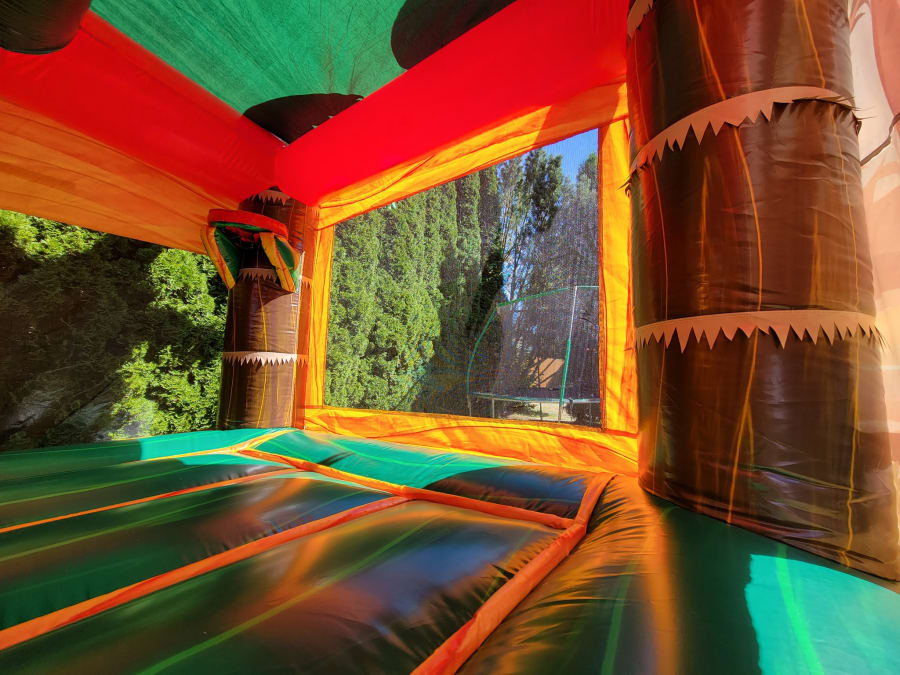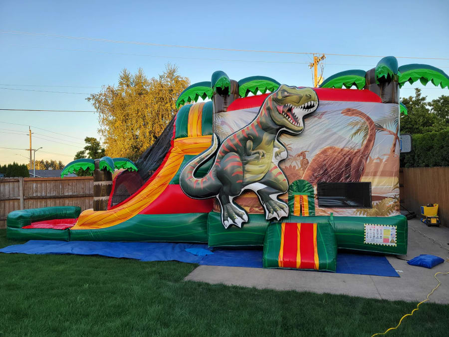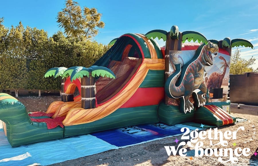 Welcome to the world of prehistoric fun with our rawr-some bounce house combo! This large and vibrant unit has beautiful marble vinyl throughout, a spacious 13'x13' bouncing area, a basketball hoop, double lane slide and can be switched between a bumper for dry use or a large pool for summer fun! This inflatable is perfect for any dinosaur loving kiddo (or adult).