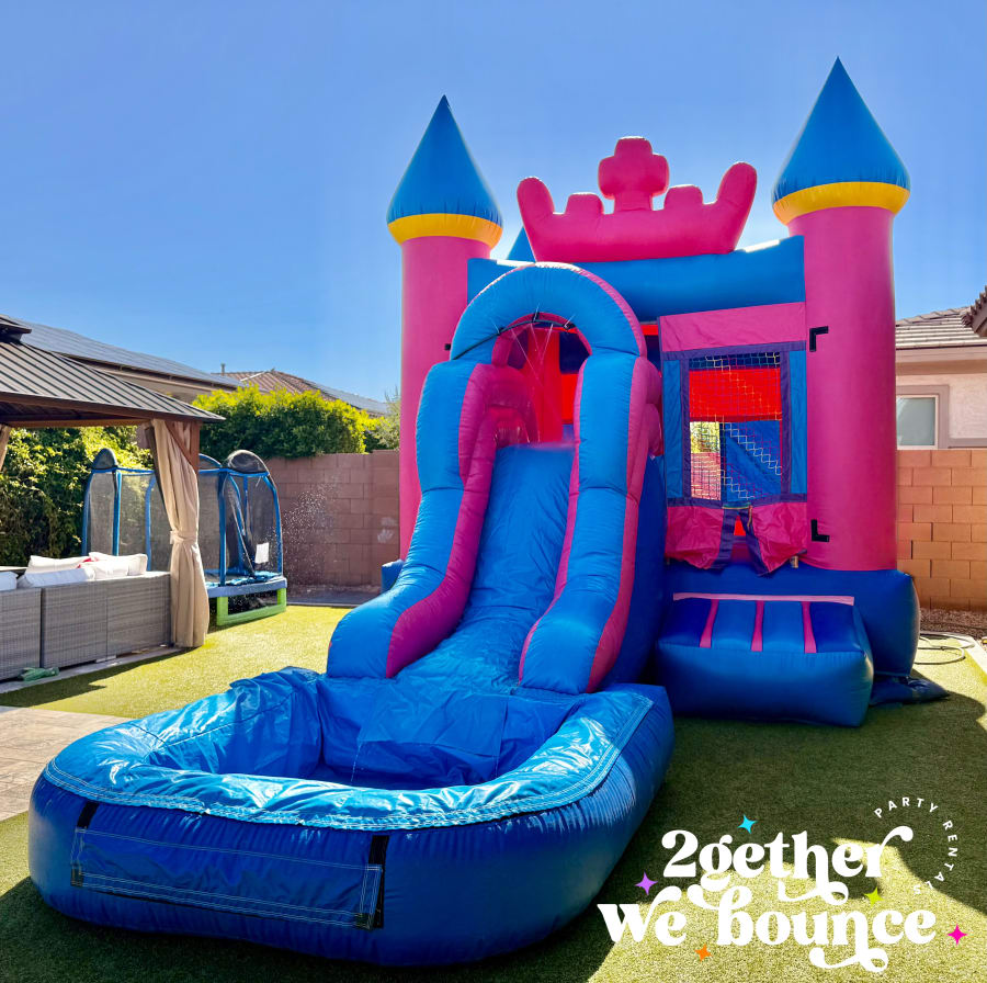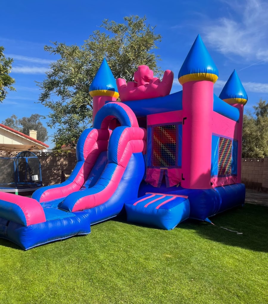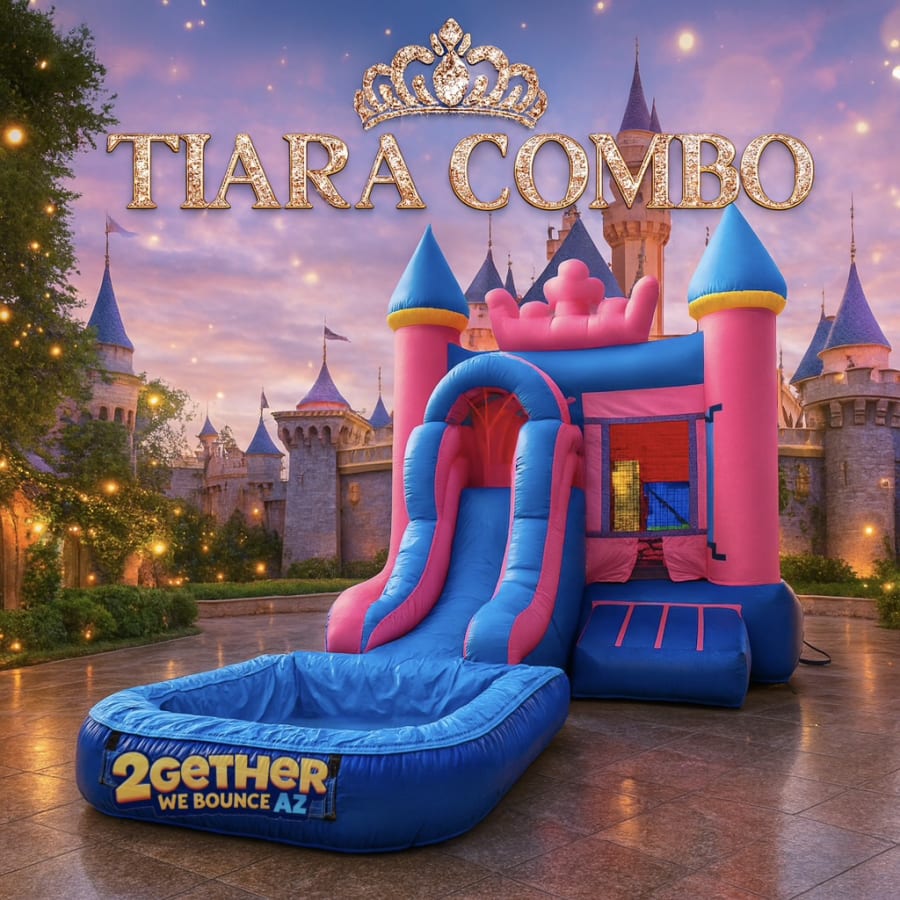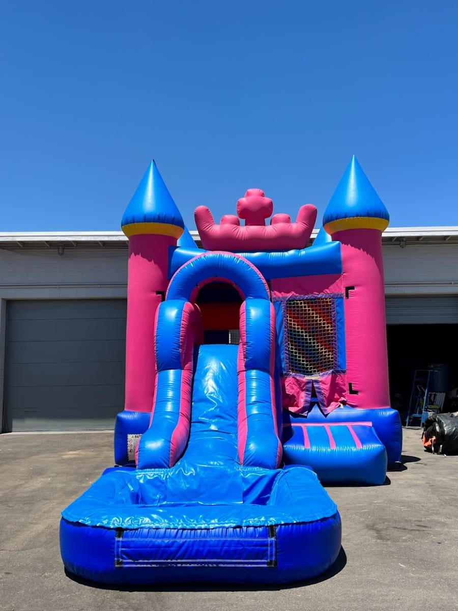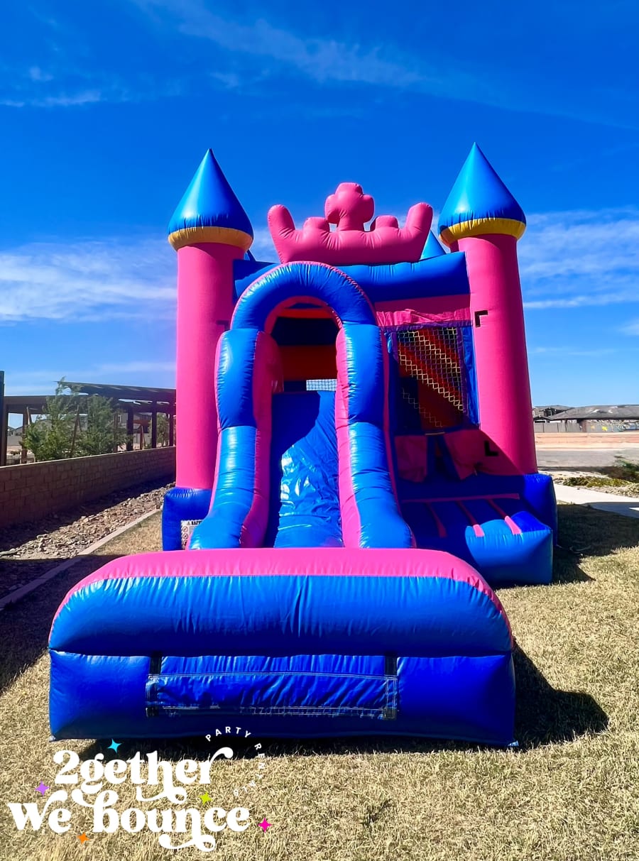 Rent this super cute bounce house combo for your next princess party! Our Tiara Combo has a standard 13'x13' bounce area - equipped with a basketball hoop and a 7ft slide.