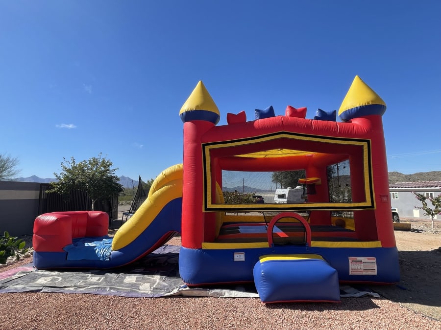 Its colorful design is perfect for any themed event. This unit has a clear design so you can easily sit back and see what the kids are doing at all times. With an external inflatable pool this unit can be used year round wet/dry.