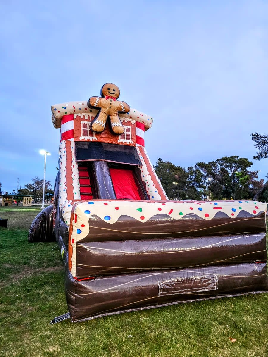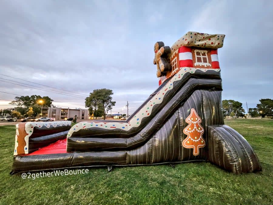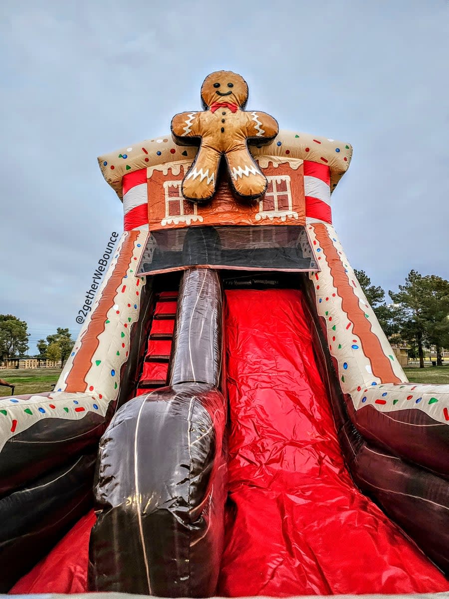 Make spirits bright with the 20ft Gingerbread House Slide — a towering holiday inflatable featuring a giant smiling gingerbread man, candy cane stripes, gumdrop sprinkles, and festive frosting details. It's the perfect blend of sugary whimsy and adrenaline-pumping fun!