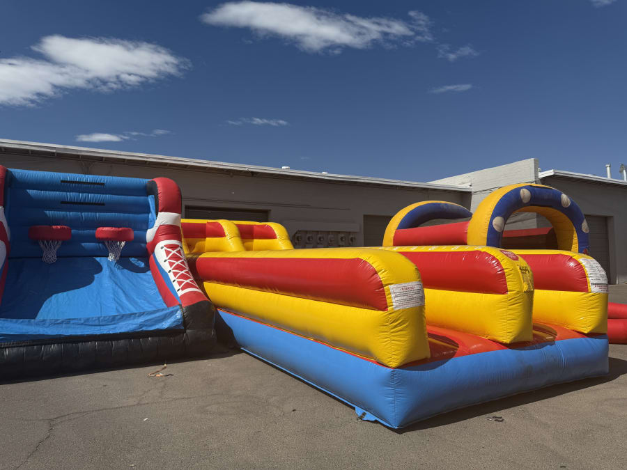 Perfect for birthday parties, school events, church gatherings, and corporate team-building. This inflatable guarantees non-stop fun for both players and spectators. Its bright red, yellow, and blue design adds eye-catching excitement to any themed event, while the soft inflatable walls keep everything safe and playful.
