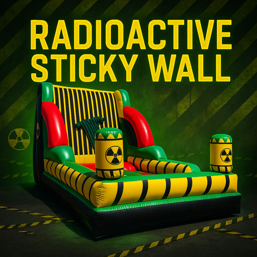 Step into the danger zone (safely, of course!) with our Radioactive Sticky Wall! This inflatable favorite comes with Velcro suits that let you run, jump, and launch yourself against the wall — and stick like you’re caught in a radioactive experiment gone wild. With its bold black-and-yellow hazard stripes and eye-catching design, it’s guaranteed to be the highlight of any school event, birthday party, or corporate challenge.