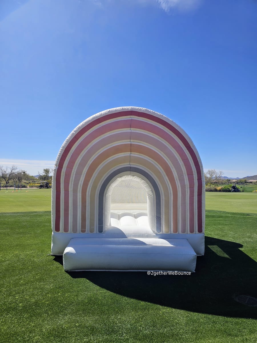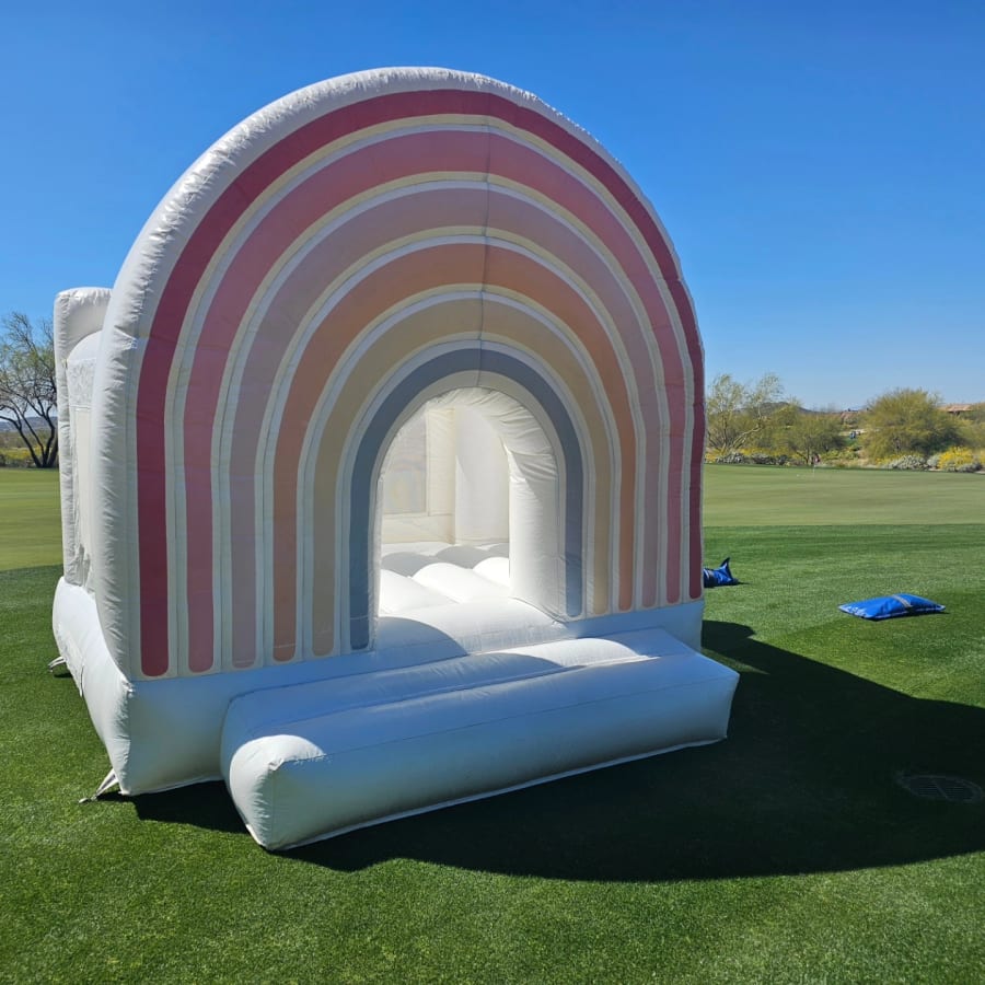 If you are looking to elevate your event and bring a modern element but still provide some fun make sure to check out our adorable Boho Rainbow Bounce House. This white bounce house provides a beautiful element to any party. With a large, muted rainbow at the entrance it ties aesthetically with your event.