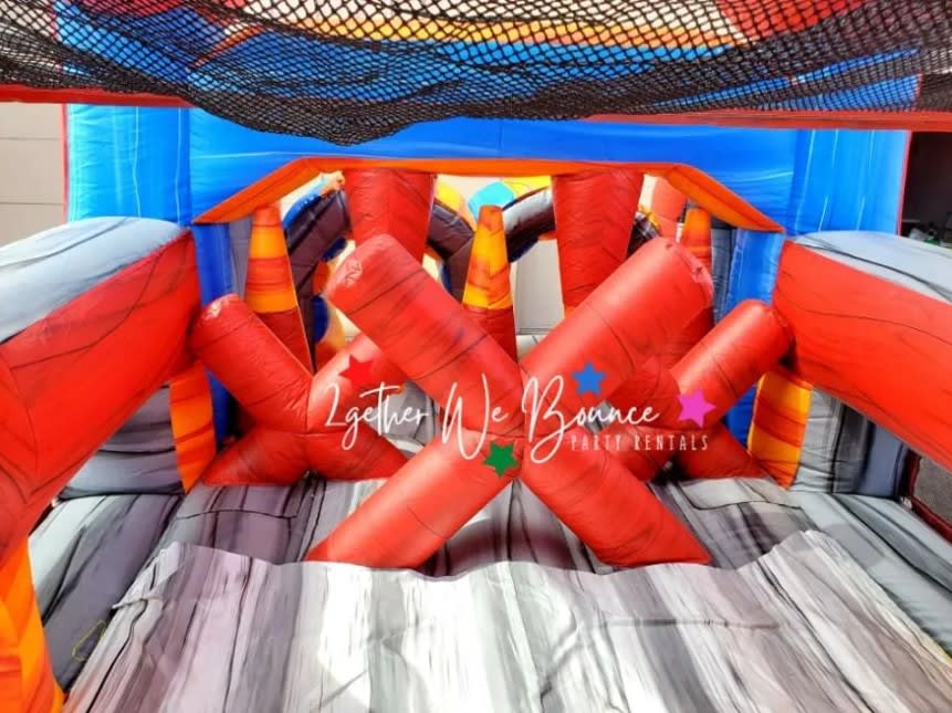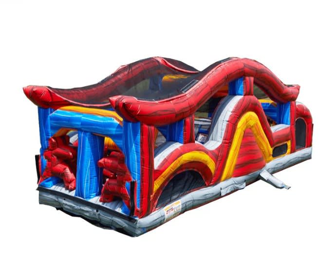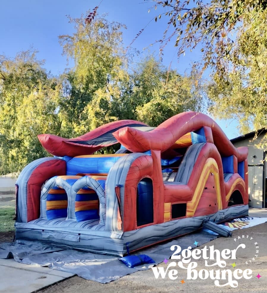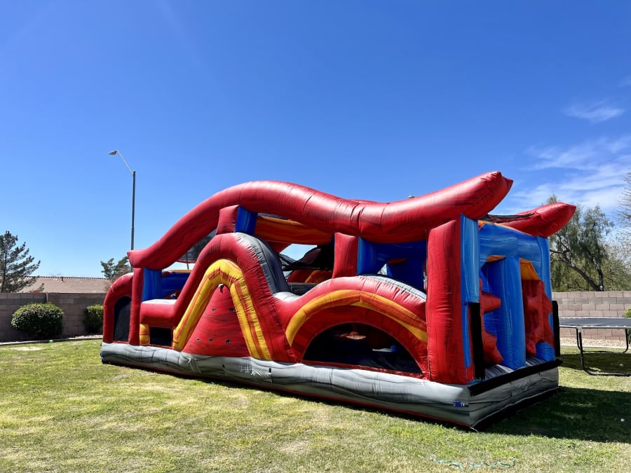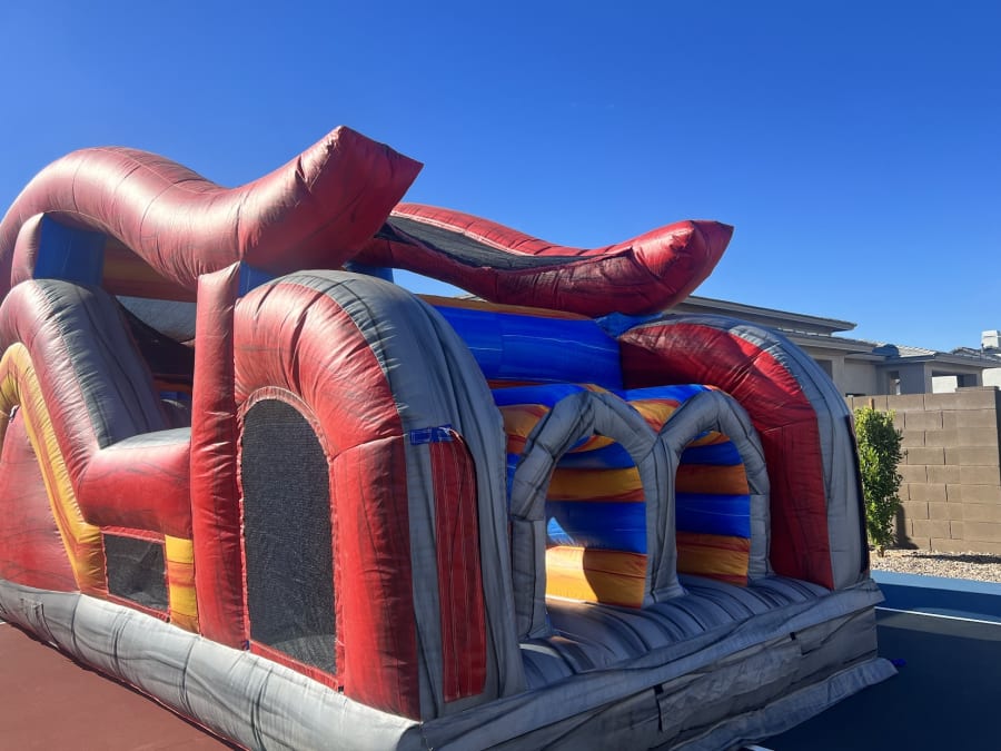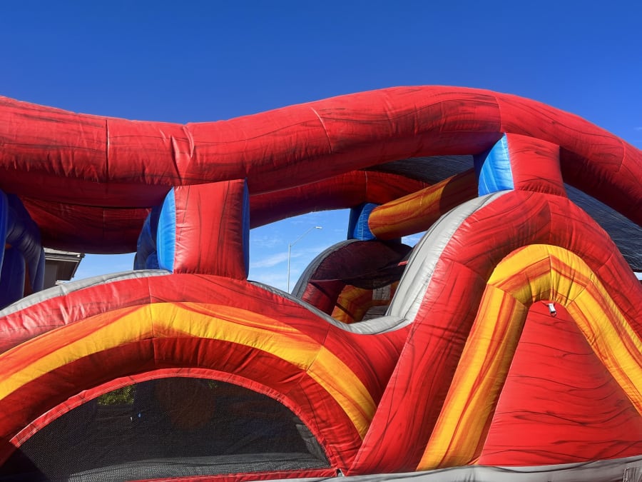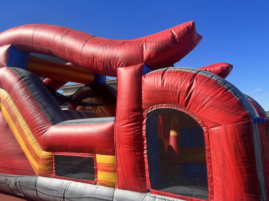 Bring the thrill of an action-packed jungle race to your next event with the Temple Run Obstacle Course – one of our most epic inflatables yet! This fiery red and yellow course is built for non-stop excitement, packed with tunnels, climbing walls, pop-up obstacles, and a dramatic double-lane slide finish.