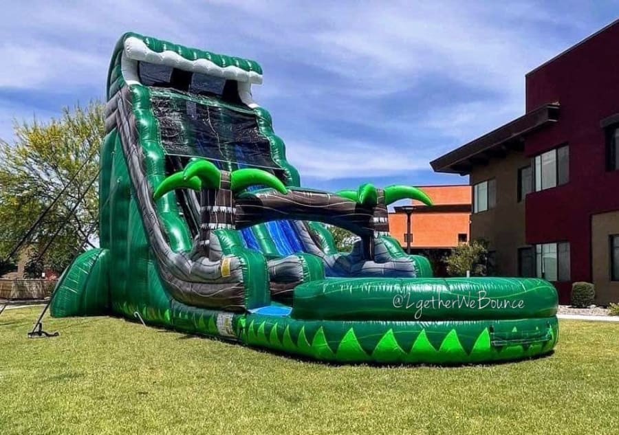 This 30ft tall waterslide has dual lanes for extra fun! You will fly down this slide with its completely vertical lanes, and land straight into a large refreshing pool. This waterslide features a tropical theme for any summer party, or just for those that like to have some staycation summer fun. This double lane water slide is much bigger in person, photos can be deceiving. If you want to make a statement this is the slide for you!