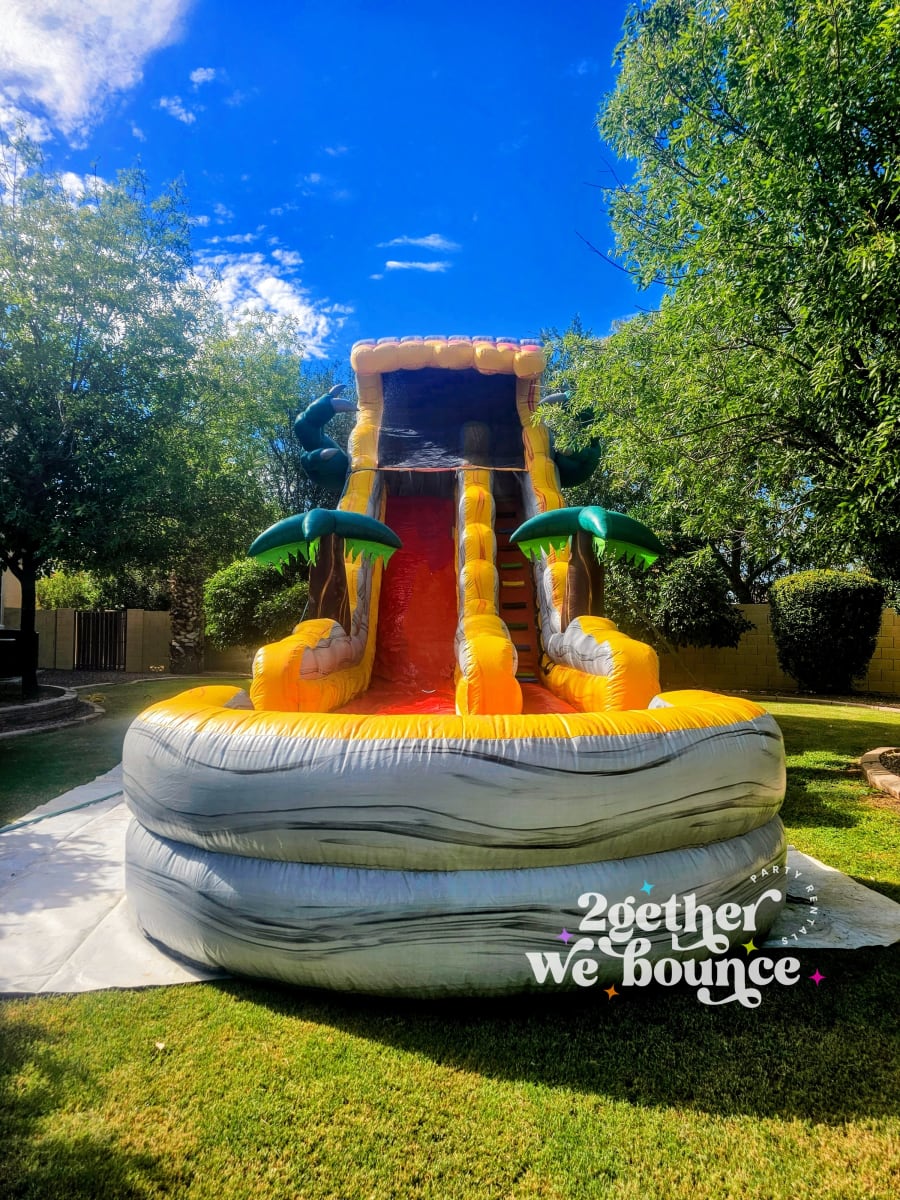 Who doesn't love T-Rex? This awesome 21-foot water slide with vibrant reds offers two huge T-Rex hands coming out of the sides almost making you feel like part of a scene in Jurassic Park! Kids and adults are sure to enjoy this thrilling water slide!