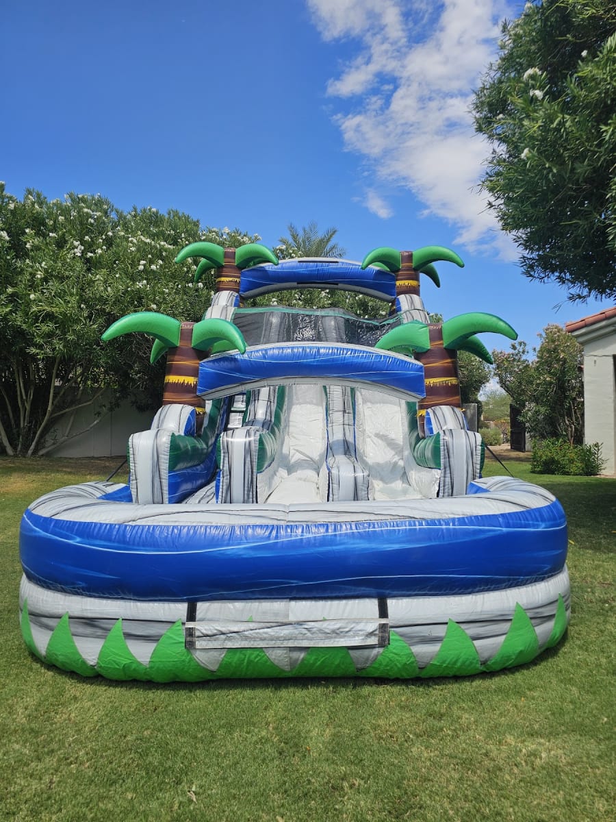 If you can't go to the beach... bring the beach home! Cool off with this beautiful tropical water slide in the comfort of your home. With vibrant shades or gray, green, and blue... a large pool and double lane slide you won't even need to spend gas to relax and have fun.