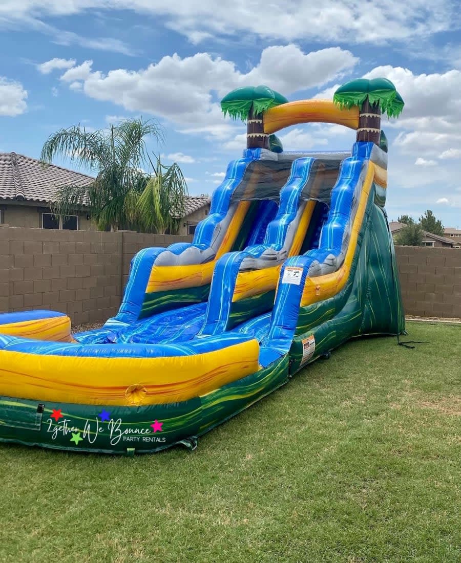 With its tropical palm tree design and bright ocean colors, this inflatable water slide instantly transforms your party into a beachside getaway.
