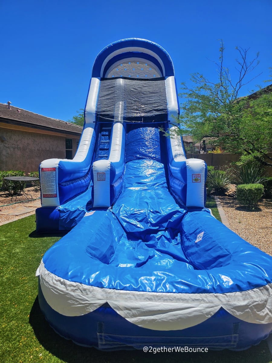 Beat the Arizona heat at your next party with our 20ft Blue Crush Water Slide. This backyard beast includes a bright blue and white design with a large pool at the bottom, keeping you cool all summer long!